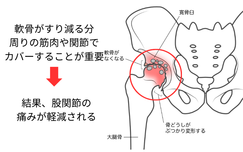股関節の軟骨によってカバーしてきた負担を筋肉と関節で補えるようにすることが重要です。